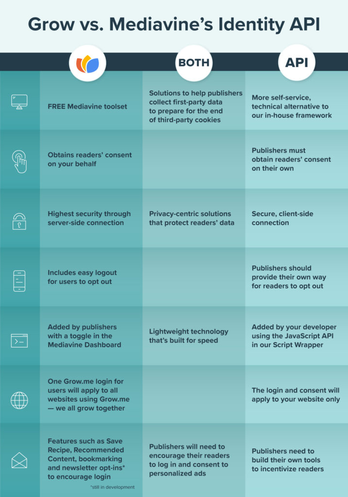 - Publishers should choose one of Mediavine’s free options for building authenticated traffic and first-party data: the Identity API or Grow.